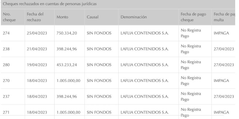 Tan sólo diez después, otro cheque de la misma productora, por un monto similar al anterior, $, 750.334,20 corrió la misma suerte y fue informado al registro de deudores de la máxima autoridad monetaria del país, sumándose a una larga lista de cheques sin fondos que, en algunos casos, se remontan al año 2019.