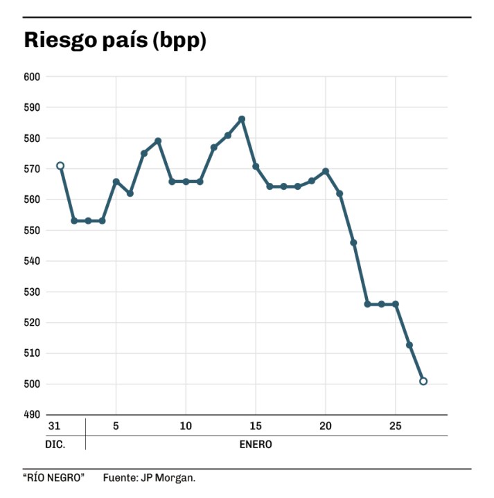 Paralelamente, el riesgo país desde comienzos de este año bajó 12% pasando de 571 puntos básicos a 494 al 27/01 (el nivel más bajo de los últimos ocho años), reflejando un aumento de la confianza en la solvencia del Tesoro.