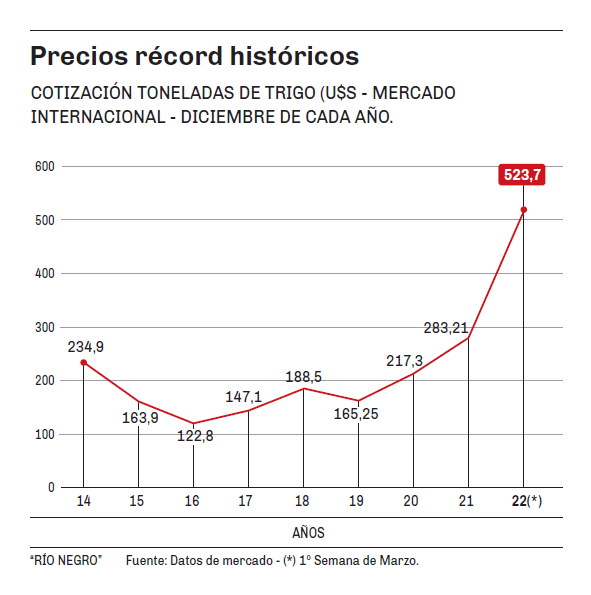 El cereal inició el año en u$s 278. A mediados de febrero, previo al inicio de la invasión de Ucrania, el precio era de u$s 292. En la primer semana de marzo y tras 15 días de ataque ruso, la cotización alcanzó su máximo precio en la historia, llegando a u$s 523,7. Implica un incremento del 88% en lo que va del año, y del 79% solo en el último mes.