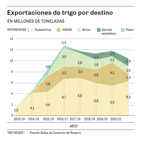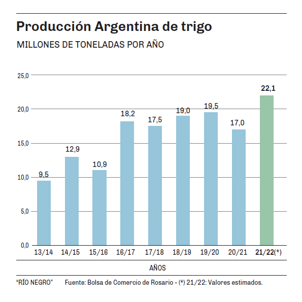 No obstante, es una enorme oportunidad de colocar una producción que este año será récord en estas pampas. Tal como se observa en el gráfico, la producción total de trigo en Argentina promedió los 18 millones de toneladas en los últimos cinco años. Este año en cambio, las proyecciones indican que podría llegar a 22 millones de toneladas.