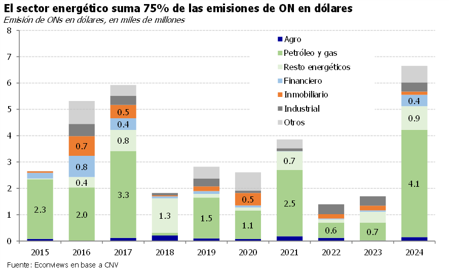 “Tres de cada cuatro dólares van al sector energético. Si clasificamos las ONs en dólares emitidas en 2024 según el sector de la empresa, el 75% o USD 5.000 millones corresponden a la energía. Dentro de esto, USD 4.000 millones son en petróleo y gas y el restante se divide entre centrales térmicas, transporte y distribución de gas y electricidad y una fracción en renovables. Supera el boom de inversión en Vaca Muerta de 2015-17, cuando se colocaron USD 2.500 millones por año en promedio” agrega el informe de Econviews.