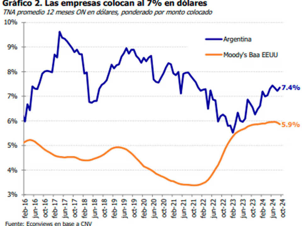 “La emisión de obligaciones negociables en dólares supera 2016 o 2017. Entre enero y octubre de 2024 las empresas argentinas colocaron bonos por USD 6,700 millones, números por encima de los de los primeros dos años del macrismo (aunque hubo 28% de inflación en dólares desde entonces)”, detalla el informe de Econviews.