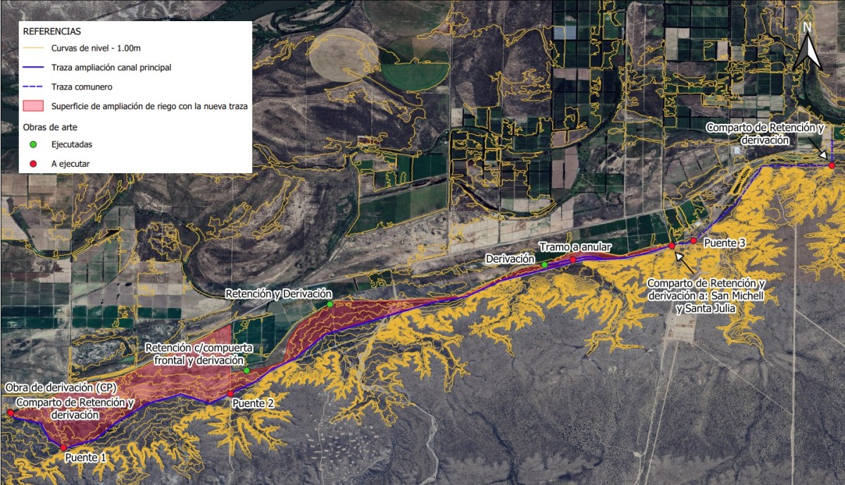 El canal se desplazará hacia el sur, al pie de la barda, para aprovechar la gravedad y llegar hasta la entrada de Agropecuaria Don Manuel. En su camino, con la nueva ubicación, permitirá incorporar hectáreas bajo riego a los productores que están a su paso.