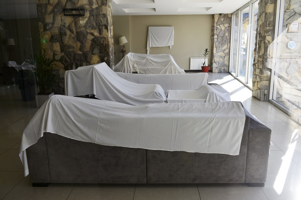 Con los muebles tapados. Así lucen los hoteles estudiantiles en Bariloche, cerrados desde abril. Foto: Chino Leiva