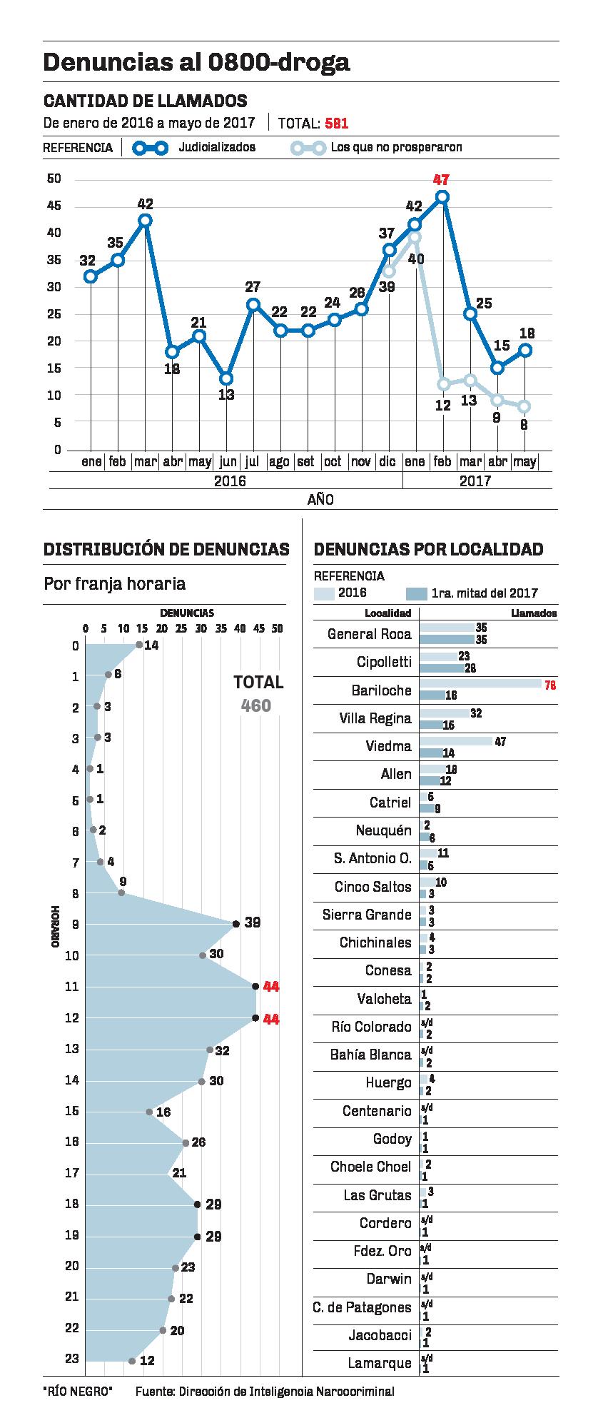 La policía rionegrina encontró en el 0800-droga un aliado para la guerra contra el narcomenudeo en la provincia. A través de esta herramienta en lo que va del año se remitieron más de 150 denuncias a la Justicia Federal, que representan el 64% de las llamadas realizadas. Roca es la ciudad que más denuncias registra, igualando la cantidad de llamados que se hicieron en todo el 2016.