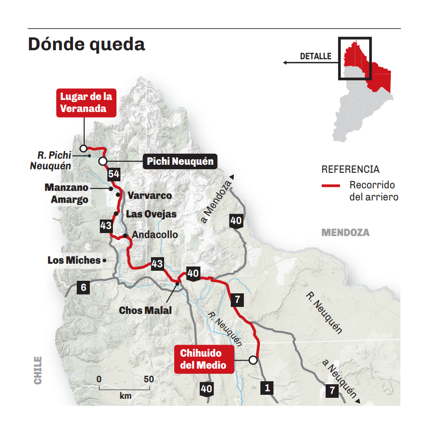 Tras pasar el puente sobre el río Pichi Neuquén hará unos tres km más para girar hacia el oeste y avanzar por un cajón unas tres horas a caballo (seis si va con los animales) hasta el antiguo puesto de piedra y barro al que pudieron agregar otra construcción de material tras llevar las bolsas de cemento a lomo de burro, los mismos cargueros que trasladan las provisiones en los arreos por tantas rutas en las que le sacan tantas fotos. Siempre piensa lo mismo cuando ve que detienen la marcha y se acercan con la cámara: “No saben de dónde vengo ni hacia dónde voy”.