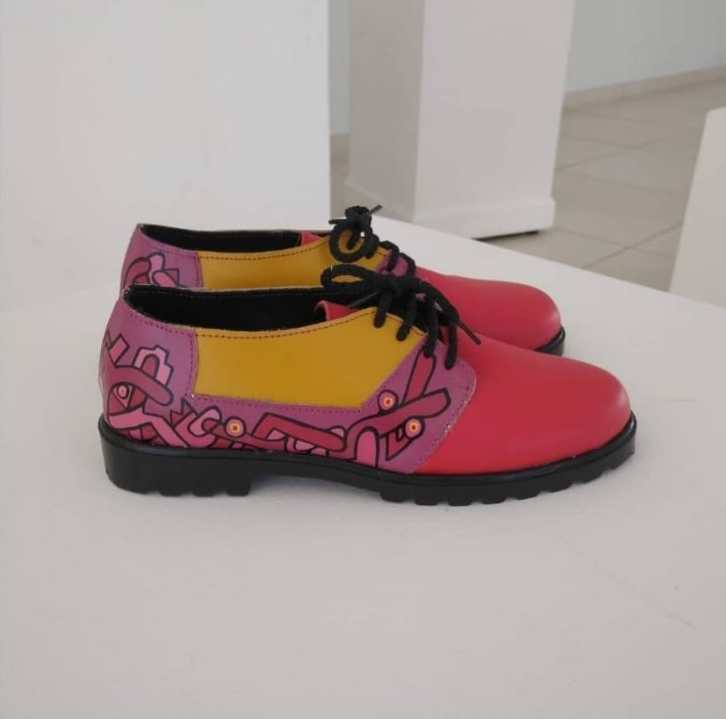 La diseñadora le llevó los cortes de cuero, le mostró los diseños y la gama cromática que iba a usar en los calzados para que Federico tuviera el contexto. A partir de ahí, inició su tarea. Relata que fue más difícil porque cambió el tamaño de la tela que está acostumbrado a trabajar, sin embargo, le resultó una experiencia muy interesante y divertida.