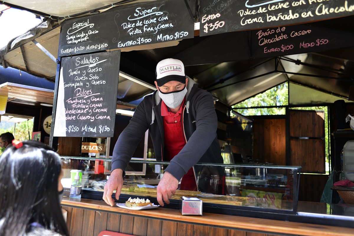 Nicolás tiene el clásico puesto de wafles en la feria. Ayer estaba ahí, con su impecable cocina. Hace poco más de un mes que volvió a la plaza. “Esperamos que a partir de ahora venga más gente, pero con precaución”, le dijo ayer a RÍO NEGRO este inglés que después de 14 años en nuestro país casi no tiene acento.
