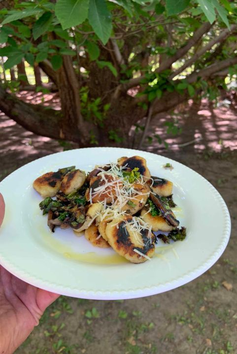 Ingredientes: 500 g puré de papa, 100 g queso parmesano, 1 huevo, nuez moscada, sal y pimienta, 1 planta de kale, 300 g hongos portobello, aceite de oliva.