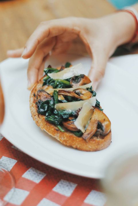 Preparación: Tostar el pan de ambos lados. Saltear en una sartén con aceite de oliva los portobellos cortados en cuartos, el ajo cortado en láminas y la espinaca. Salpimentar. Colocar la preparación anterior sobre la bruschetta. Agregar las escamas de parmesano y terminar con un chorrito de aceite de oliva.