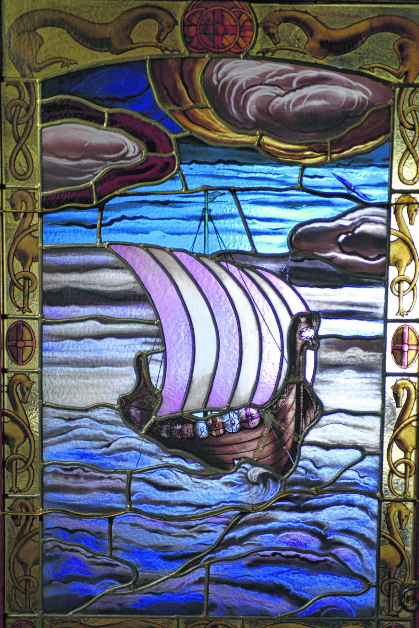 Uno de los vitraux originales de la casa que se mantiene, con una imagen típicamente escandinava.