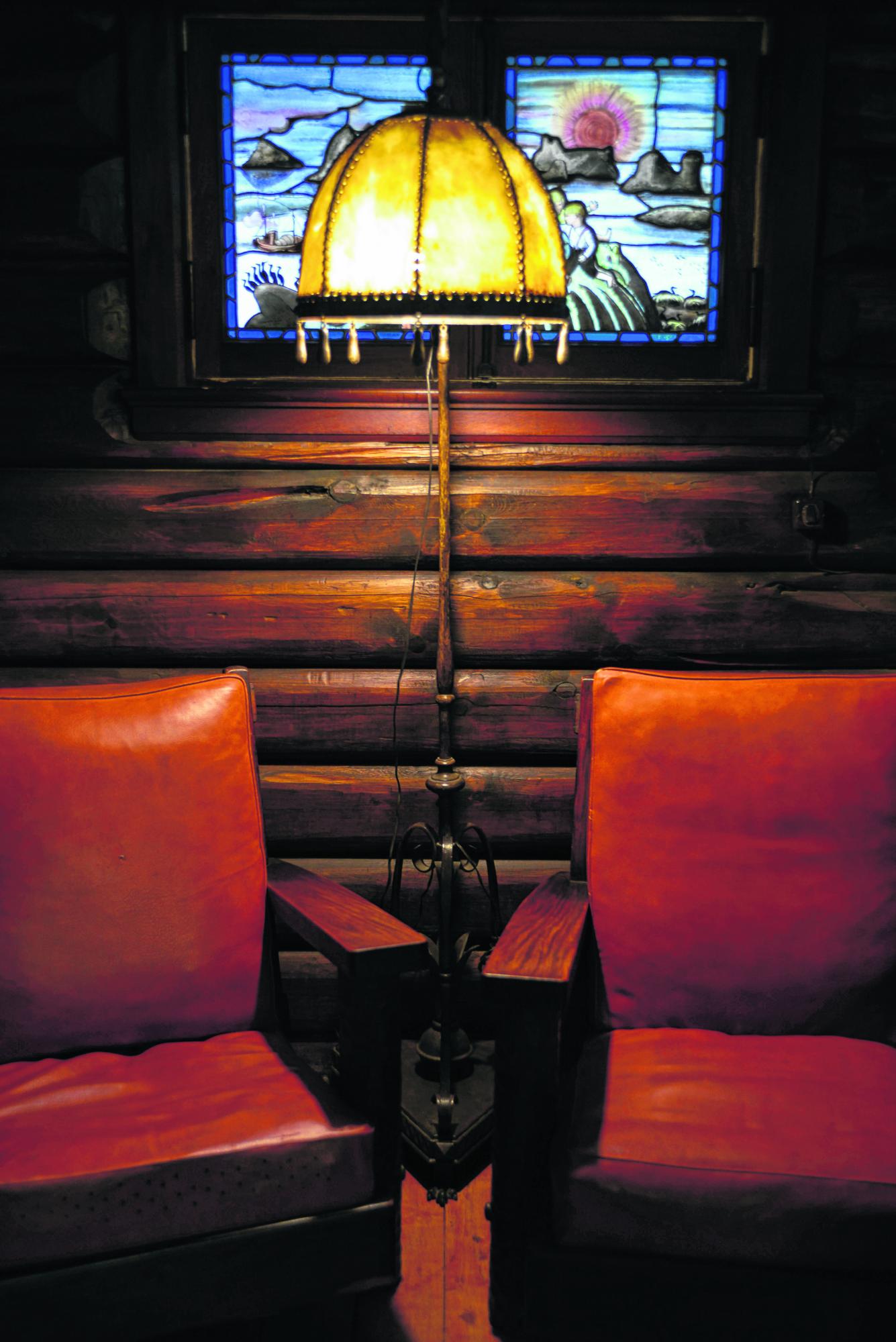 La lámpara de pie es la que usaba la familia Nielssen. Detrás, otros dos vitraux que podrían no ser originales.