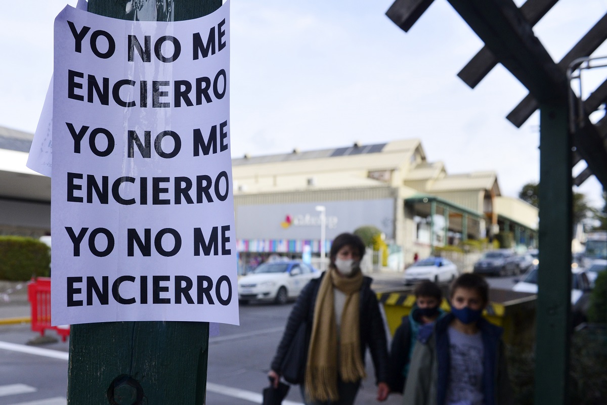 «Desobediencia civil Ya!. Basta de atropellos. Todo trabajo es esencial, defendamos nuestros derechos«, rezaba uno de los carteles, mientras que otro repetía la frase «Yo no me encierro», en alusión al cierre estricto por 9 días que rige desde mañana.