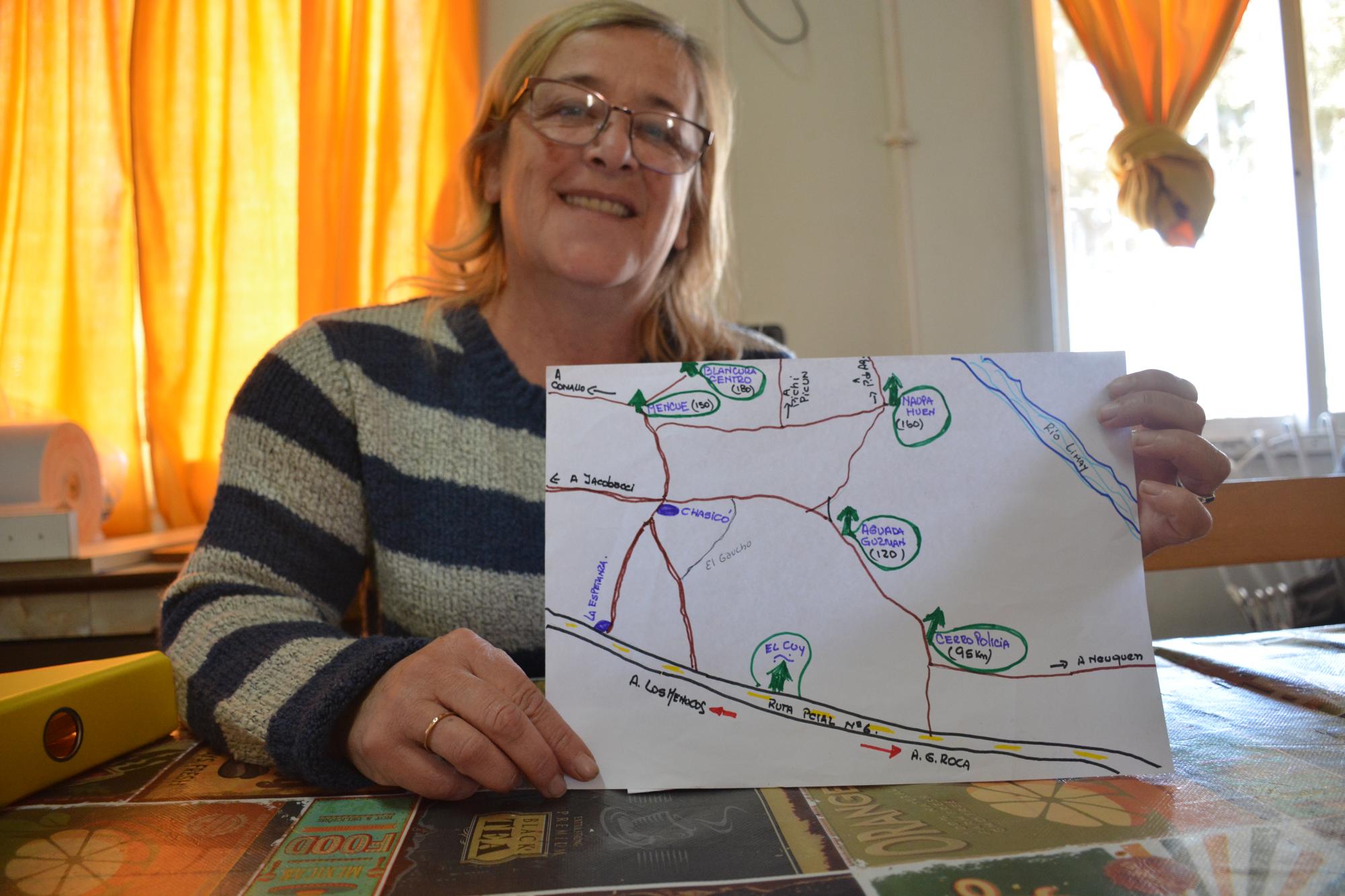 Al plantear que el hospital nuclea y atiende las necesidades de cinco centros de salud de la zona (como muestra en el dibujo), destacó que es fundamental tener redes de comunicación para cumplir de manera responsable con el trabajo. La localidad -de 540 habitantes a 109 km de Roca- sólo cuenta con telefonía fija y esto no les permite cargar informes de vacunas, recetas de PAMI y facturaciones. Remarcó también que de forma reiterada se quedan totalmente incomunicados: “Esto lo reclamamos por necesidad”.