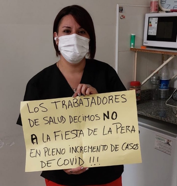 “Siempre apoye la Fiesta de la Pera, hoy como personal de salud digo no! El covid-19 avanza, no da tregua, un poco de empatía y solidaridad. El recurso humano del hospital también se enferma, hace dos años que el Covid-19 no nos da tregua, estamos agotados”, expresó Paola Orellana, que está a cargo de la jefatura del área DAPA.