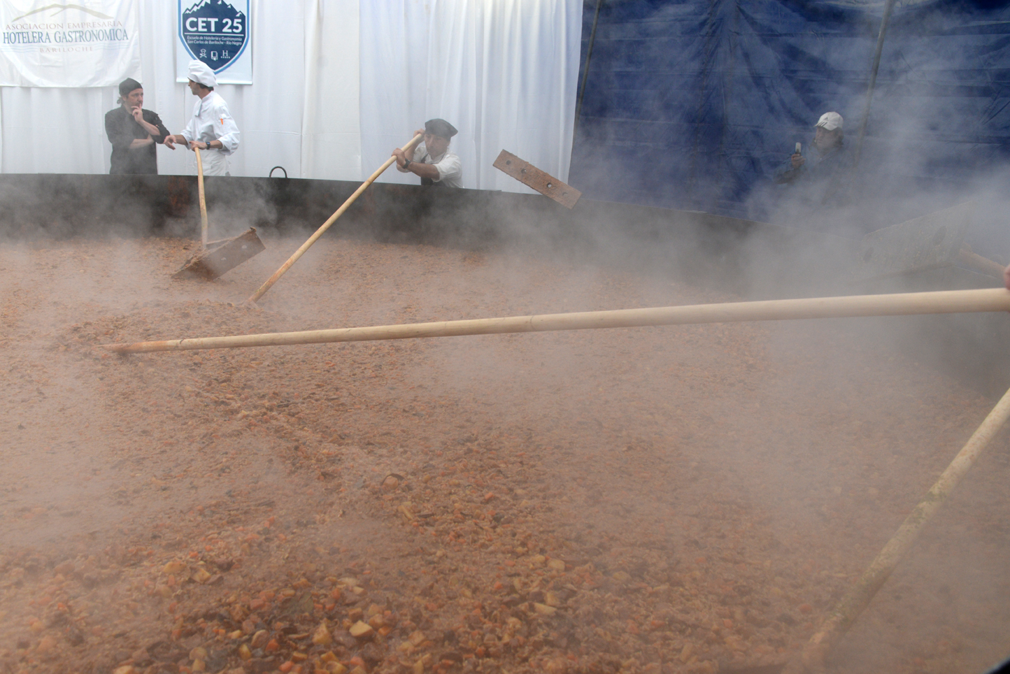 “No hay algo así en el mundo. Preparamos 4,5 toneladas de guiso en esta ocasión, muy similar al año pasado. Usamos una olla de 6.40 metros de diámetro y 40 centímetros de profundidad. Revolvemos con remos. Entre profesionales y estudiantes de la Escuela de la Hotelería, participaron 80 cocineros”, indicó el chef a cargo, Pablo Quivén.