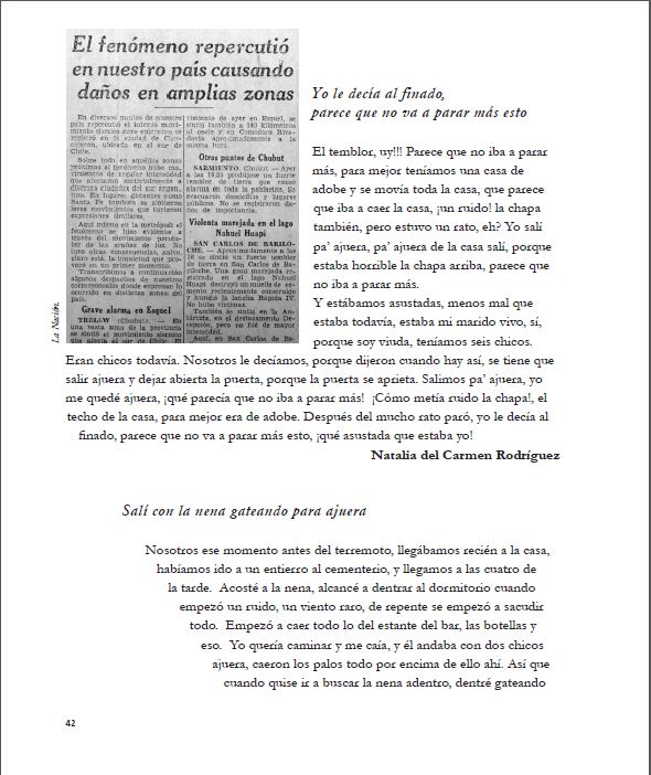 Pero, cuando comenzó a trabajar con Archivos del Sur , en la Biblioteca Bayer, participó de algunas entrevistas a pobladores del lugar, y en esos diálogos escuchó por primera vez sobre el terremoto. “Quedé muy asombrada. De golpe, empecé a escuchar historias que quebraban la idea de paraíso. Se resquebrajaba, para mi, la idea idílica del turismo”, dice.