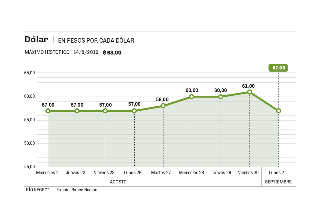 En la apertura, el dólar se vendía a $ 63 en el Banco Nación y a $ 65 en el promedio en entidades privadas. Minutos más tarde, se conseguía a $59 en el Banco Nación y a $60 en promedio en el resto de los bancos y casas de cambio del microcentro porteño. Finalmente, en el Nación el dólar cerró a $57, una baja de %6.56 respecto del del viernes. El promedio minorista quedó en $58,41. En el mayorista cerró a $56, unos $3,50 menos que el viernes, una caída del 5,90%.
