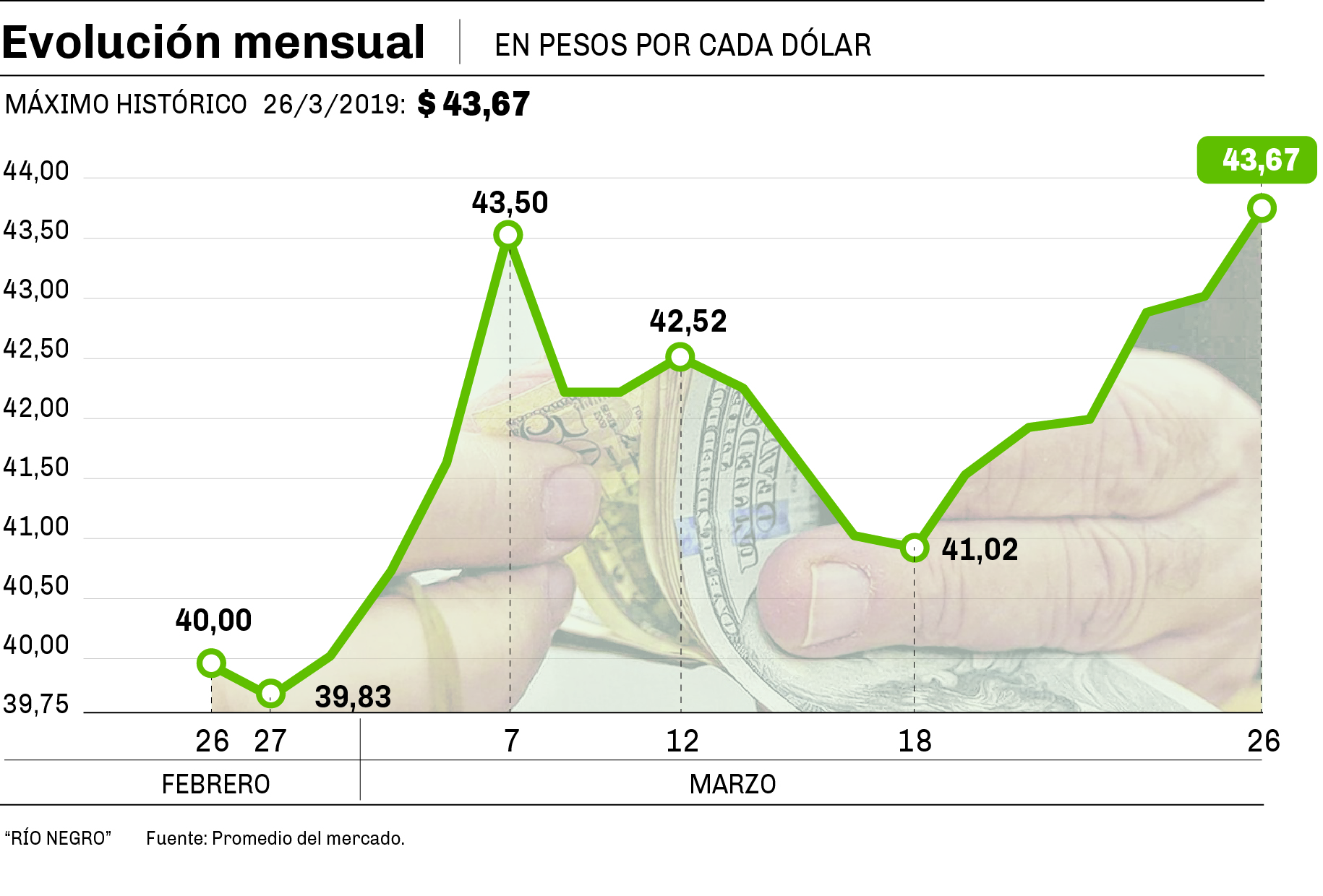 El dólar minorista avanzó ayer 68 centavos y marcó un nuevo récord histórico al cerrar en $43,67 promedio.
