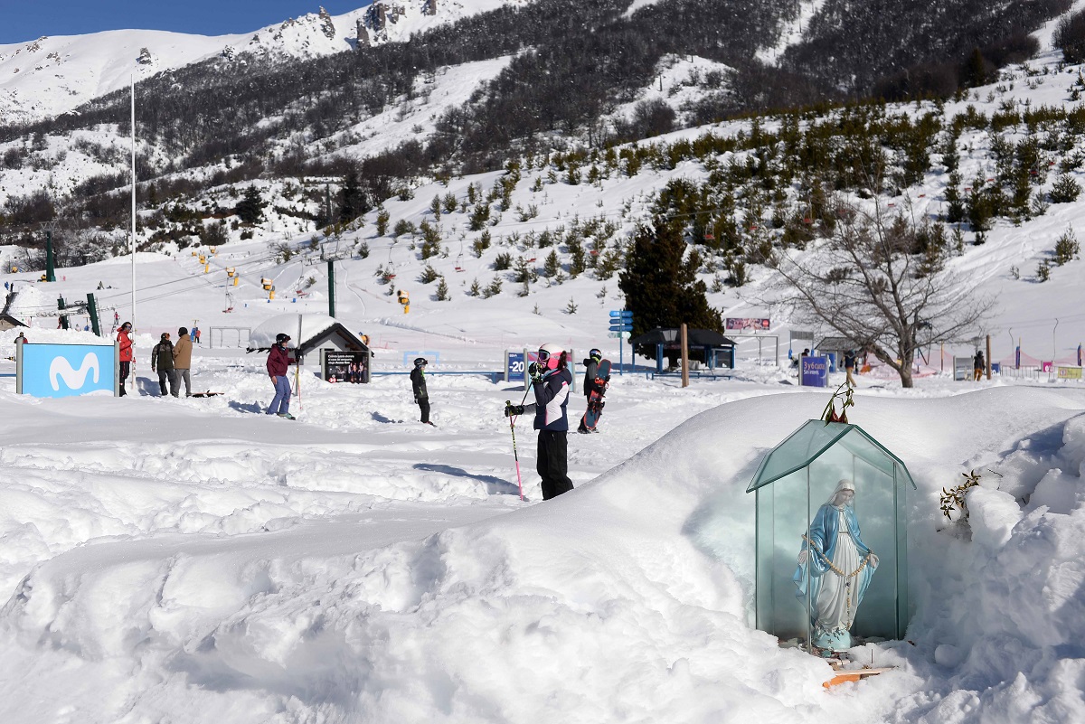 En la base del cerro Catedral, la imagen de una virgen María cubierta de nieve. Foto: Alfredo Leiva