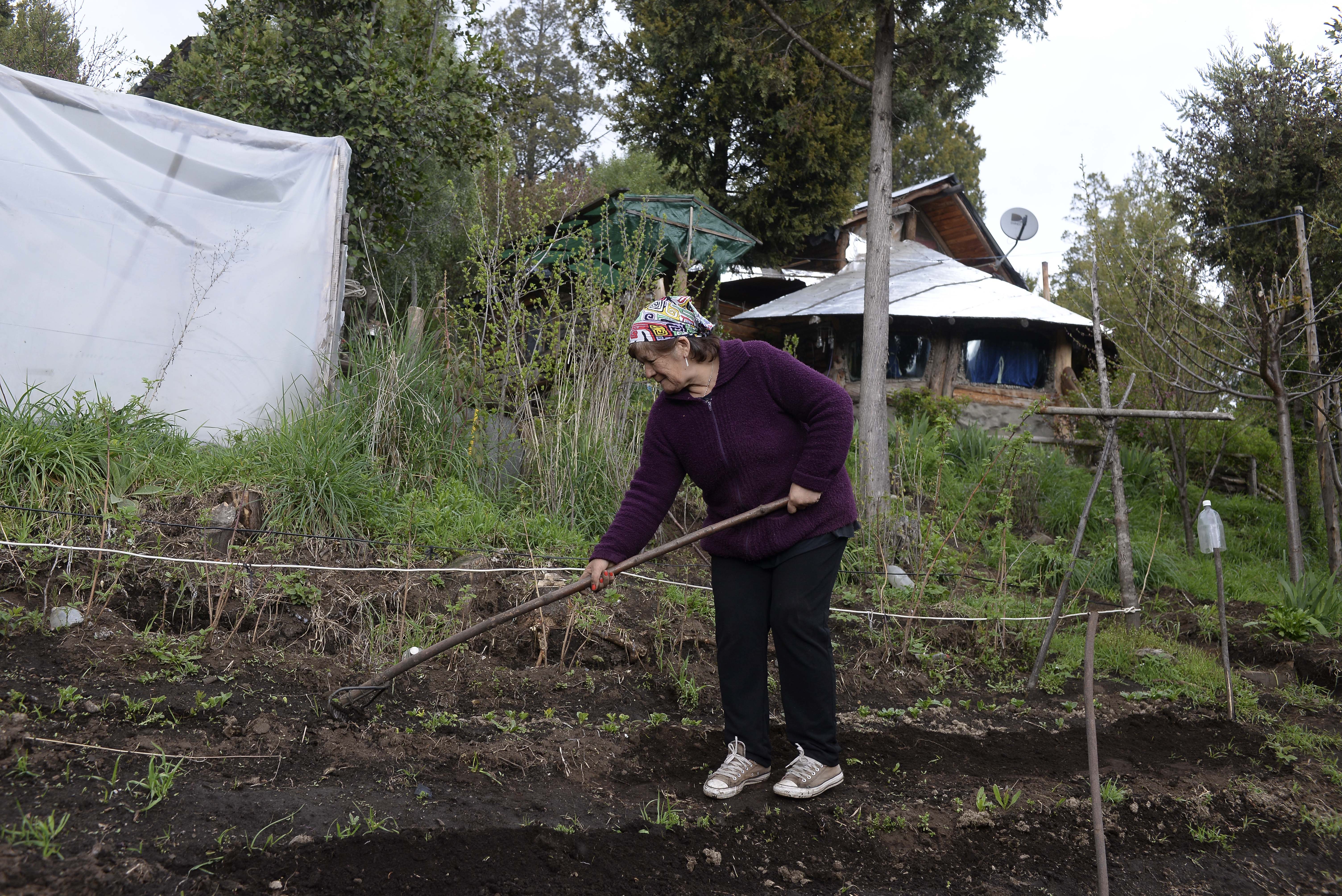 Cuando abandonó Comodoro Rivadavia para establecerse en El Bolsón, Eliana Rubilar pasó por varios alquileres. Pero a esta pensionada, madre de siete hijos, sus ingresos no le alcanzaban ni para subsistir. “En ese momento, mis hijos eran adolescentes. No podía pagar alquiler, vestirlos, comprar calzado y comer. Uno de mis nietos me averiguó y un muchacho chileno me entregó este terrenito. Él se iba y me cedía la tierra”, relata la mujer sin dejar de trabajar en su huerta.