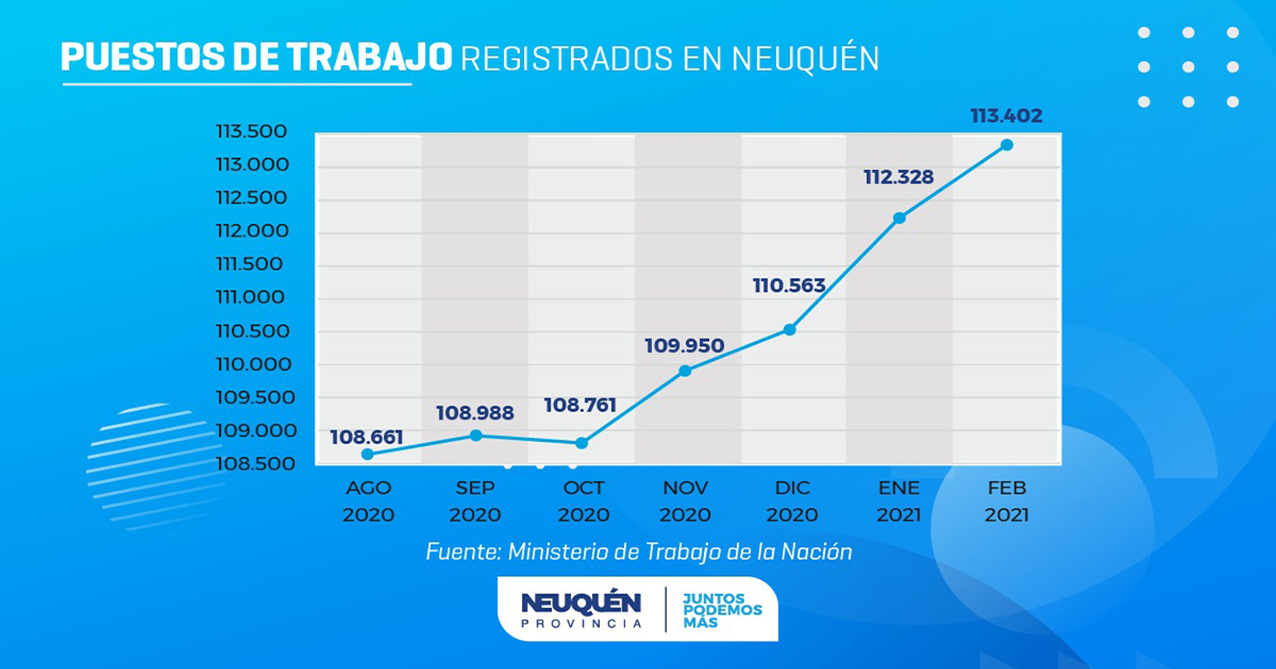 Ese mes, Neuquén tuvo 108.661 empleos registrados; y desde entonces comenzó a crecer: 108.988 en septiembre, 108.700 en octubre, 109.950 en noviembre, 110.563 en diciembre, 112.098 en enero y los 113.402 de febrero.