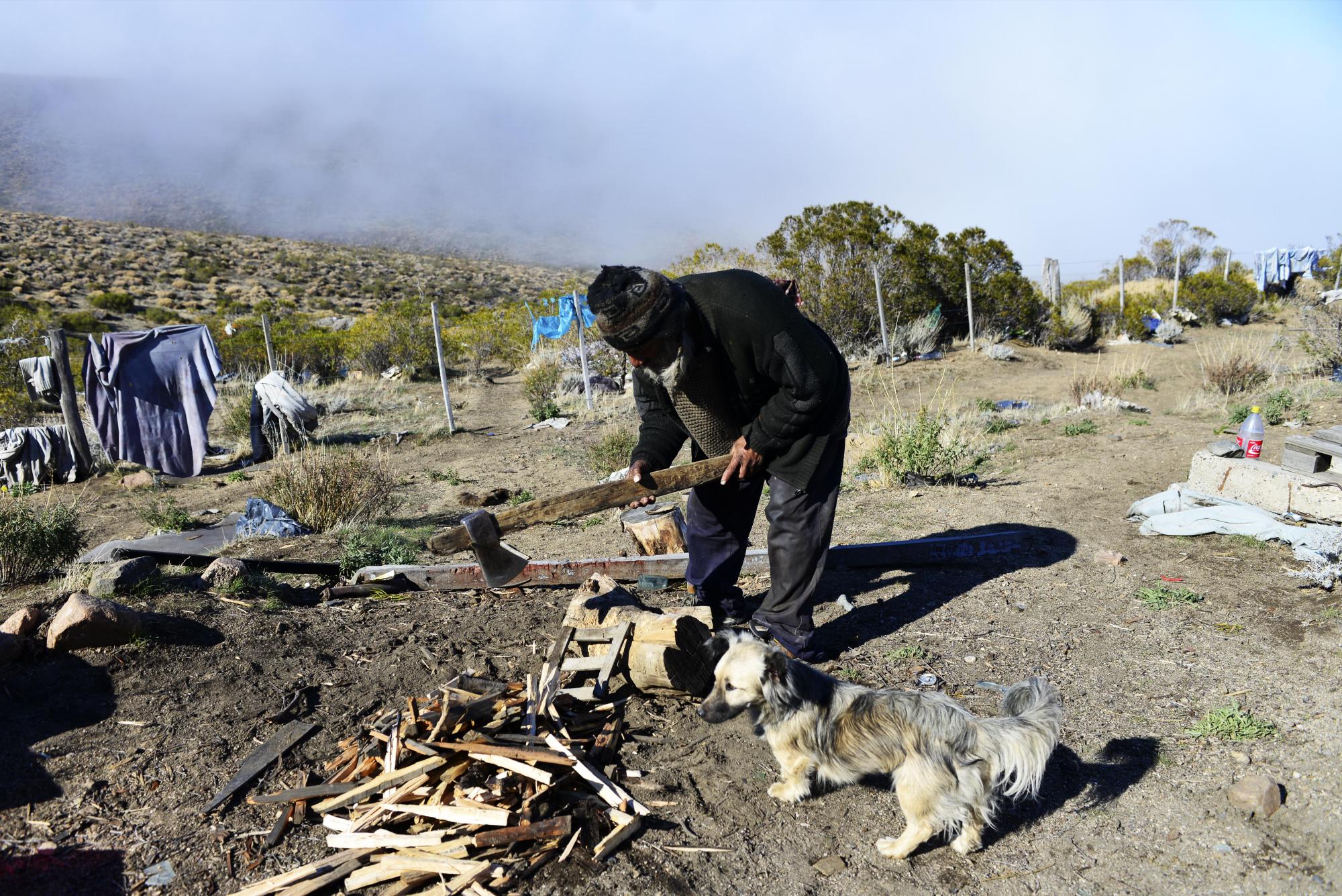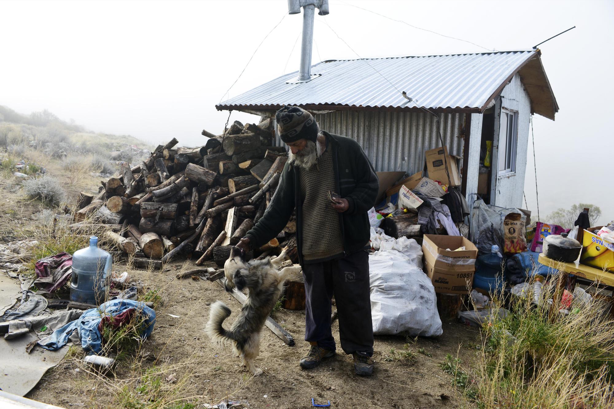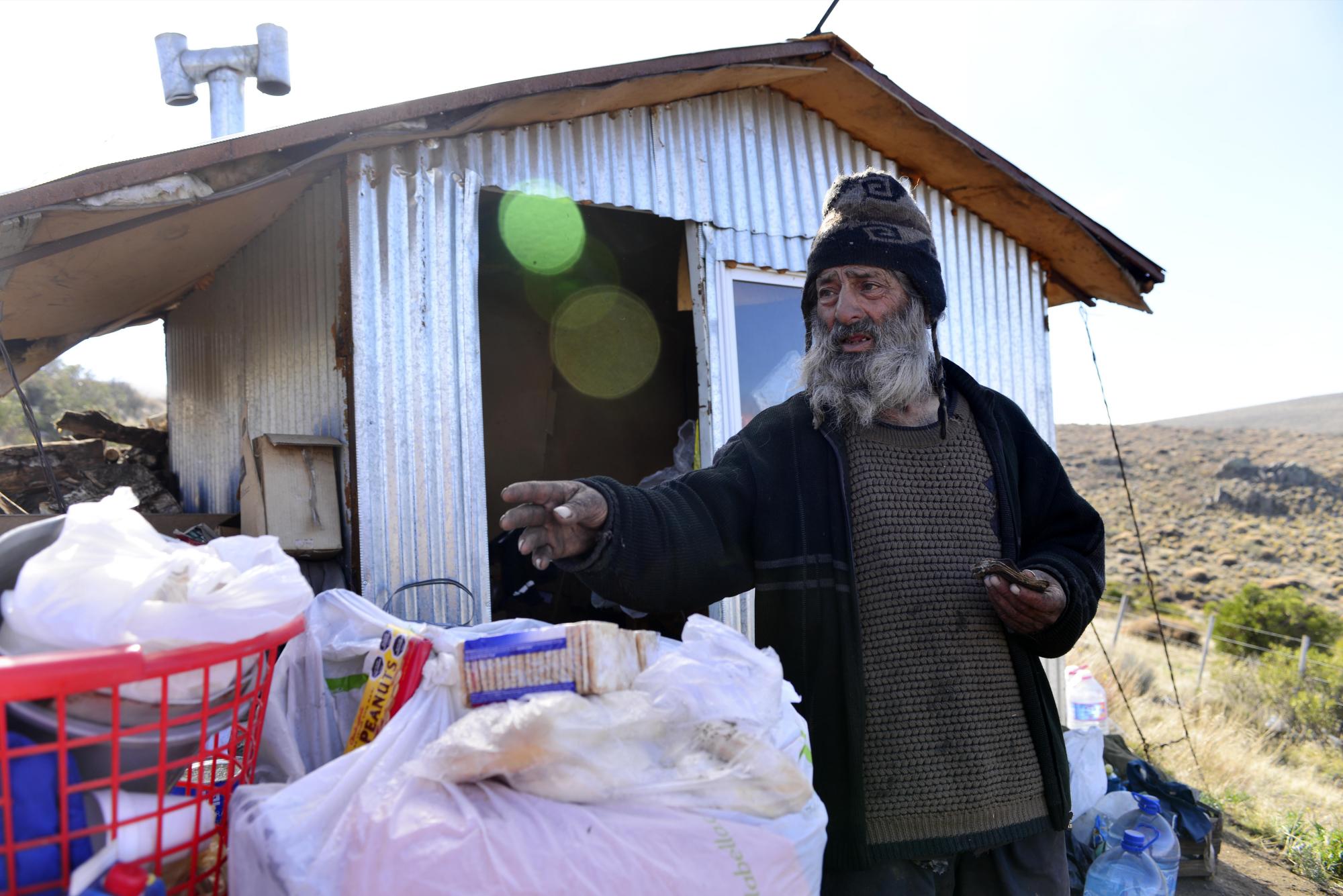 Ni las heladas ni las nevadas logran alejarlo de ese pequeño retazo de tierra que limita con la ruta y el alambrado de un campo de miles de hectáreas. “Acá las madrugadas y las mañanas son heladas”, explicó. “A veces me resfrío un poco”. Sólo hace fuego al aire libre para cocinar algunos fideos o la carne que recibe de personas que detienen su marcha en ese punto. Aclaró que la estufa a leña de la casilla sólo la prende cuando nieva. Le falta un hacha afilada y una lona para cubrir la leña que su hermano le llevó.