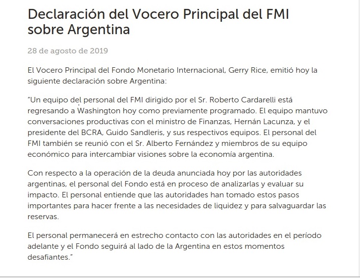 Poco después de la palabra de Lacunza, el organismo internacional emitió un escrito para brindar su apoyo al país y adelantar los pasos a seguir en la negociación de la deuda.