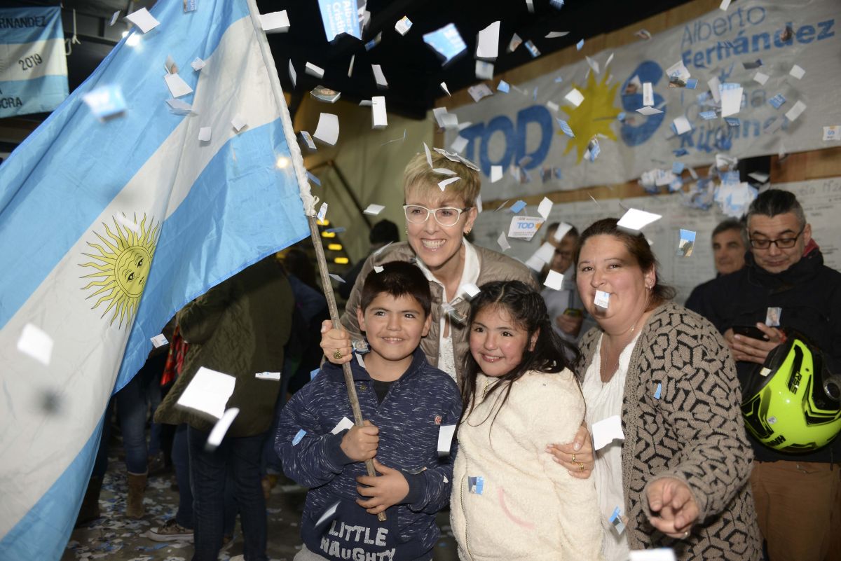 El Frente de Todos festeja en Bariloche en el local de campaña de la senadora Silvina García Larraburu y en el Centro Cívico bajo la lluvia.