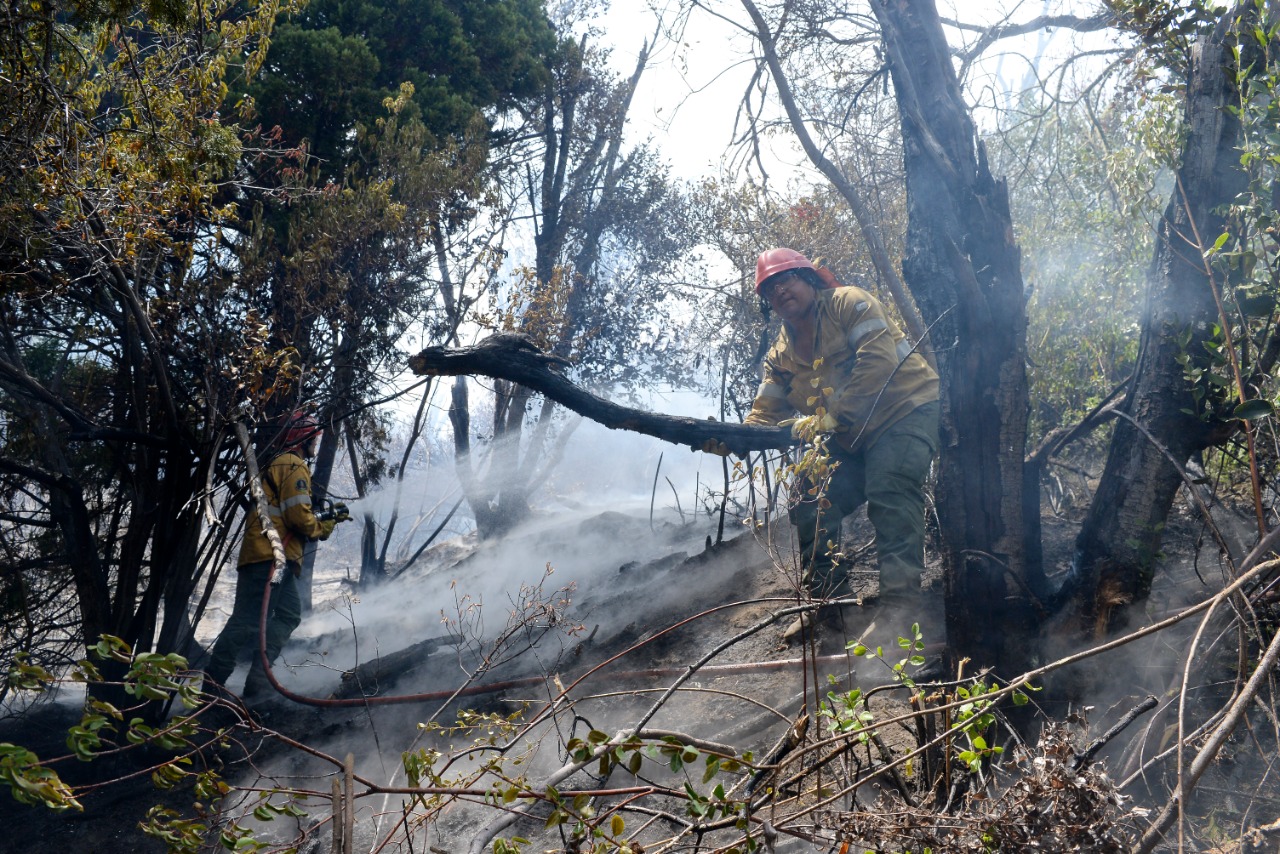 Mientras tanto, una autobomba del Splif se detenía a un costado de la ruta y de otra camioneta, una decena de brigadistas bajaba con palas y motosierras. Con dificultad por la tierra seca, emprendían el ascenso por el empinado monte.