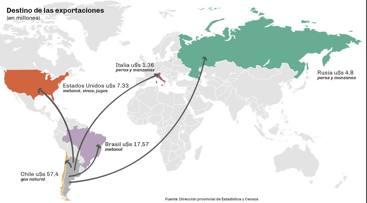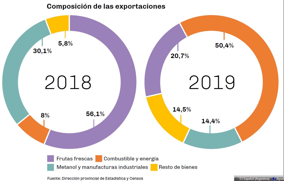 El rubro de combustibles y energía volvió a ocupar más del 50% del total de envíos al exterior realizados en la provincia, desplazando a los productos primarios como las peras y manzanas , que pasaron a representar poco más de un 20%, según publicó la dirección provincial de Estadística y Censos de Neuquén.