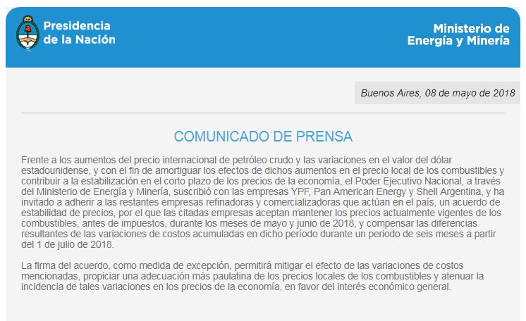 El Ministerio de Energía informó que el acuerdo busca amortiguar los efectos de los aumentos del precio internacional del crudo y las variaciones del dólar y “contribuir a la estabilización de los precios de la economía” local.