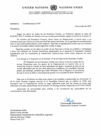 El gobierno nacional denunció este lunes que la dirigencia saliente dejó deudas con organismos internacionales como la Organización de Naciones Unidas (ONU), por alrededor de 150 millones de dólares. La gravedad de esa situación implica que el país pueda perder representatividad en esos espacios, como castigo por la falta de pago.