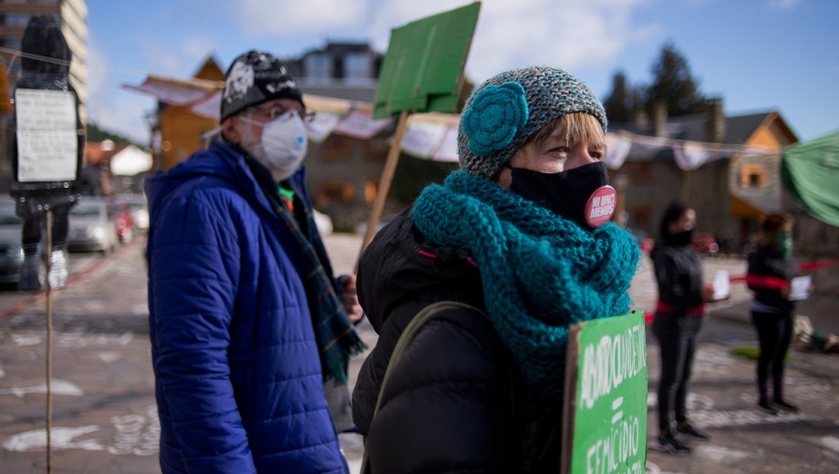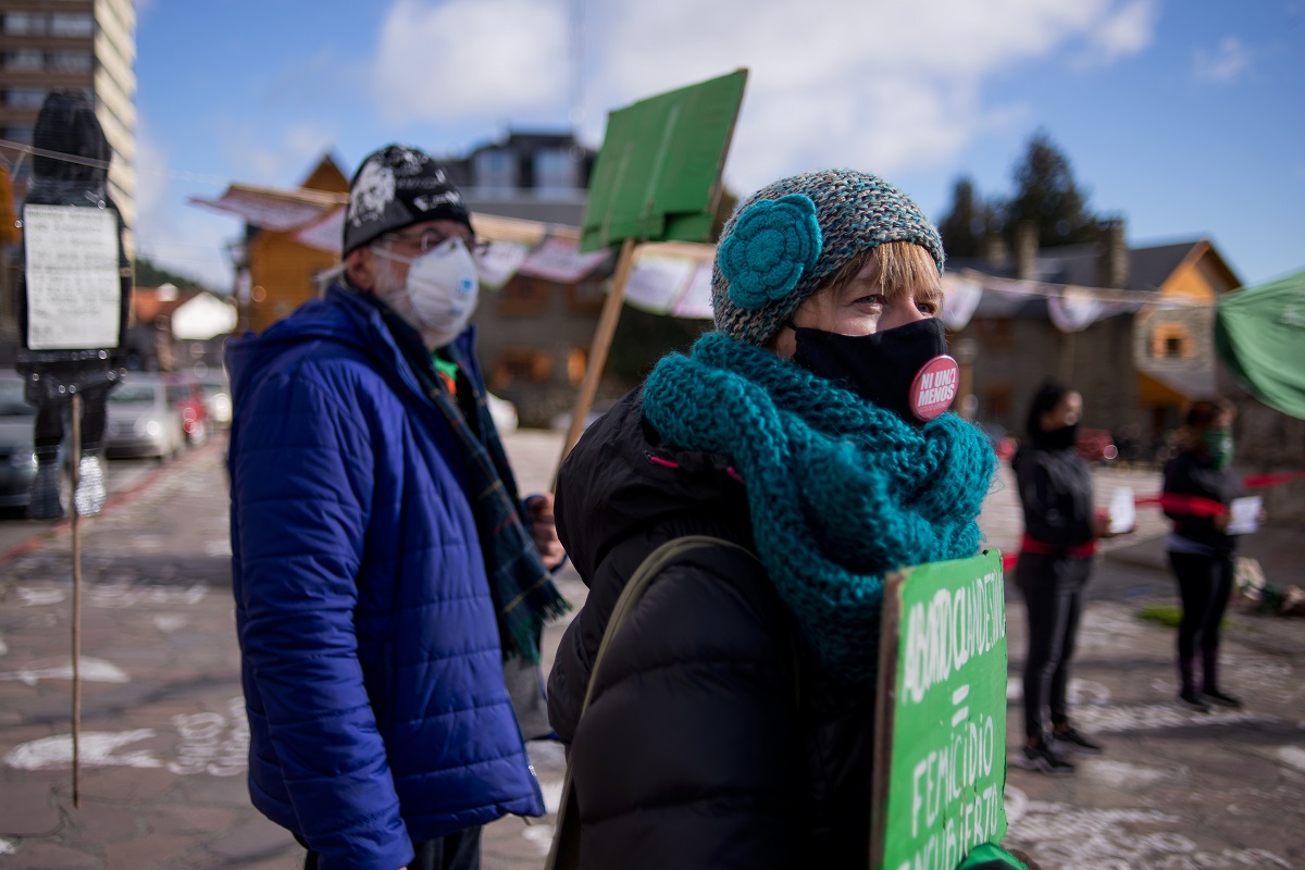 Mujeres del movimiento Ni Una Menos de Bariloche reclamaron políticas públicas para atender la creciente violencia de género y los femicidios en la región y el país, con una intervención pública donde primaron los pañuelos verdes.