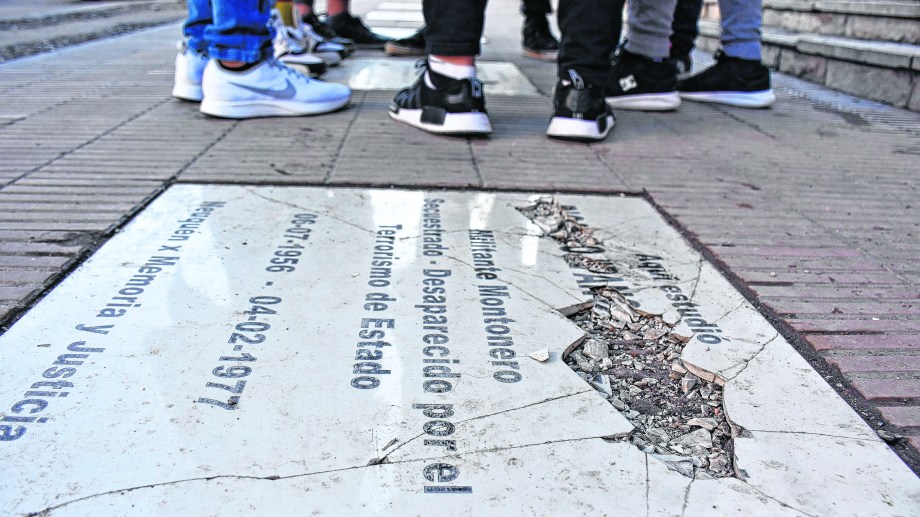 La primera marcha de los organismos de Derechos Humanos está señalizada en la plaza Roca como parte de los “hitos” o marcas de la historia social en la ciudad.