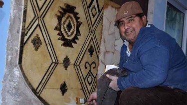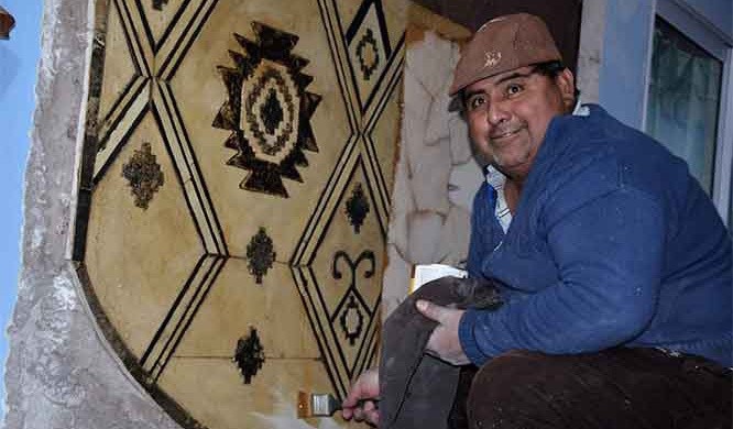 Sebastián Llanquitrú, o “Fillol” como lo llaman por su pasión futbolera, trabaja la piedra laja hasta transformarla en una obra de arte. Con paciencia y dedicación, ha hecho pisos, el escudo provincial que se ve en la Legislatura y hasta una vereda de Bariloche.