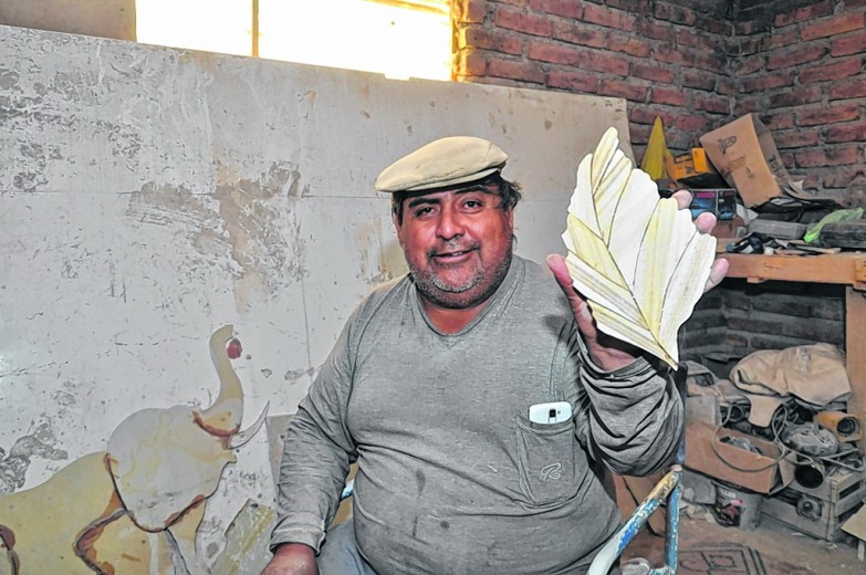 En su galpón de trabajo, entre caladoras, amoladoras, sierras, lijas y resina, pasa la mayoría de las horas del día haciendo volar su imaginación y dando rienda suelta a su creatividad. Allí lija y da forma a la piedra laja, en ese taller ubicado en el fondo de su casa, en Los Menucos.