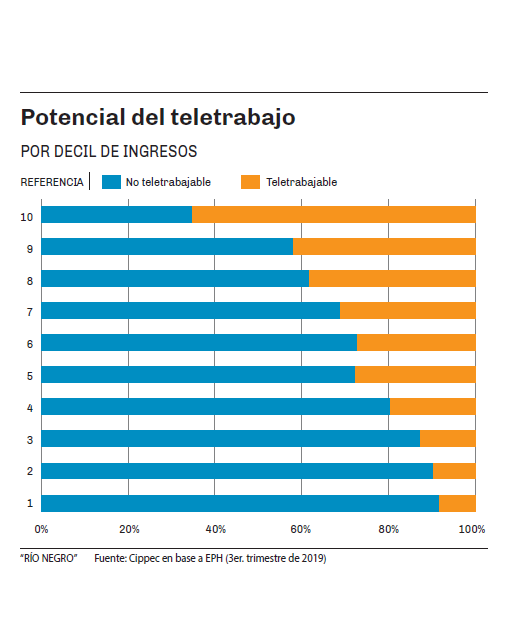 Por último, las diferencias surgen del nivel de ingresos. Si se divide a los trabajadores en deciles, resulta que el decil 10 (10% de mayores ingresos) tiene un potencial de teletrabajo del 73%, y el decil 9 tiene un 43% de posibilidades de trabajar desde el hogar. Por el contrario, el decil 1 (el 10% de menores ingresos) tiene solo un 8% de potencial de teletrabajo, y el decil 2 un 10%.