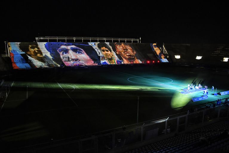 Cinco exjugadores de fútbol se congregaron en torno a un escenario montado en el estadio del Bicentenario de la ciudad de San Juan y le brindaron un homenaje a Diego Maradona, en la previa del encuentro entre Boca Juniors y Banfield.