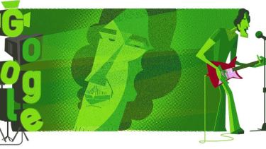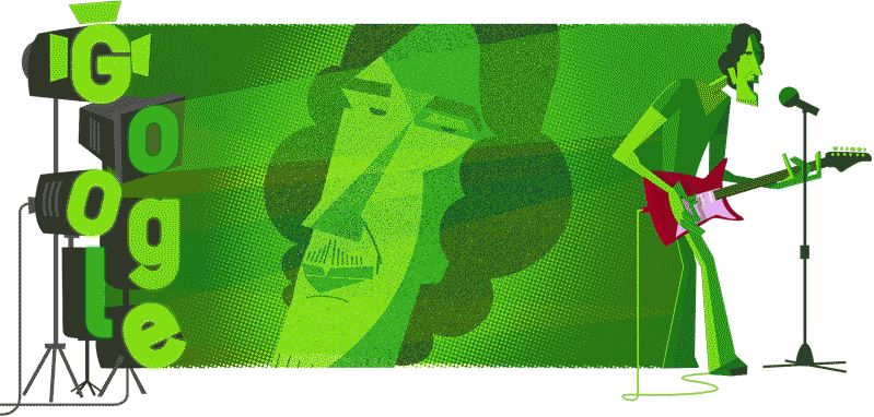 En la portada del buscador, se presenta el dibujo. Aparece "El Flaco" Spinetta cantando delante de un fondo verde. Hoy se celebra el día nacional del músico.