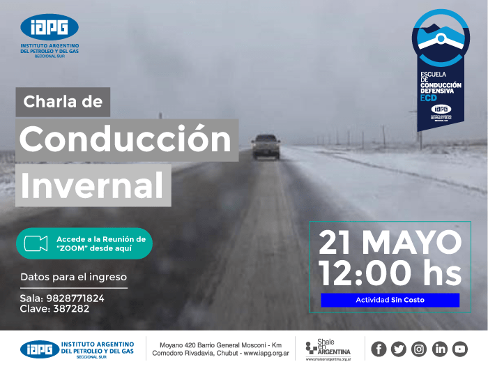 El Instituto Argentino de Petróleo y Gas seccional Sur realizará una charla de Conducción Invernal mañana viernes 21 de mayo a las 12 del mediodía. La actividad será de manera virtual y no tiene costo.