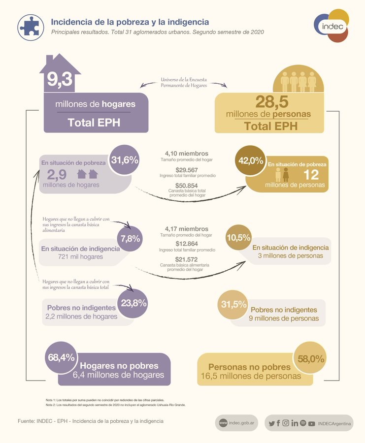 Si se toma una población estimada en 45,8 millones de habitantes, al cierre de 2020 los nuevos porcentajes informados implican que 19,2 millones son pobres, y entre ellos, 4,5 millones son indigentes.
