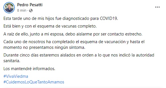 El intendente Pedro Pesatti cumplirá aislamiento por ser contacto estrecho de un caso positivo de coronavirus, según informaron en un comunicado. Deberá mantenerse aislado durante al menos cinco días.