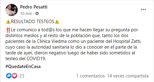 Lo hizo a través de Facebook donde indicó que «los dos pacientes de la Clínica Viedma como un paciente del Hospital Zatti», cuyo caso la autoridad sanitaria lo dio a conocer en el parte de la tarde de ayer, dieron negativo luego de haber sido sometidos al testeo del COVID19″.