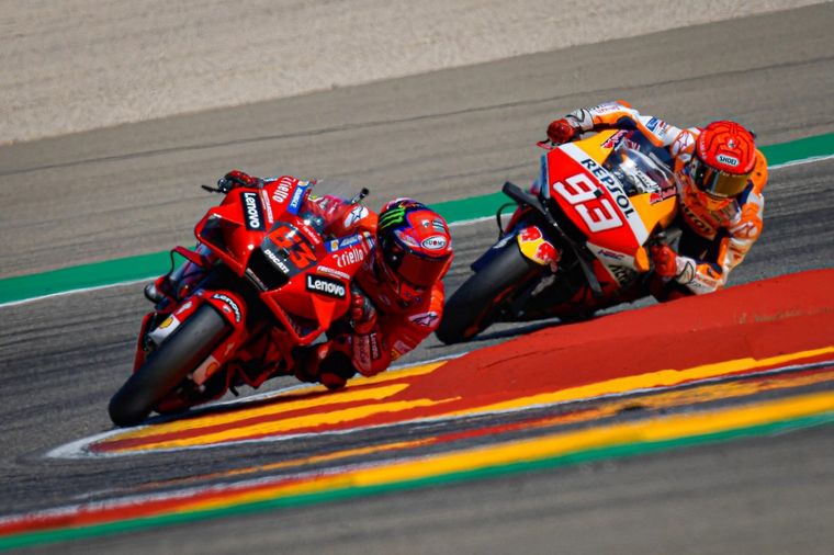 El italiano Francesco Bagnaia, con Ducati, ganó este domingo el Gran Premio de Aragón de Moto GP, y por primera vez en el mundial de la categoría reina de motociclismo, que por la 13ra. fecha del campeonato de la especialidad, se corrió en el Motorlan español, tras una intensa lucha con el séxtuple monarca, el español Marc Márquez (Honda).