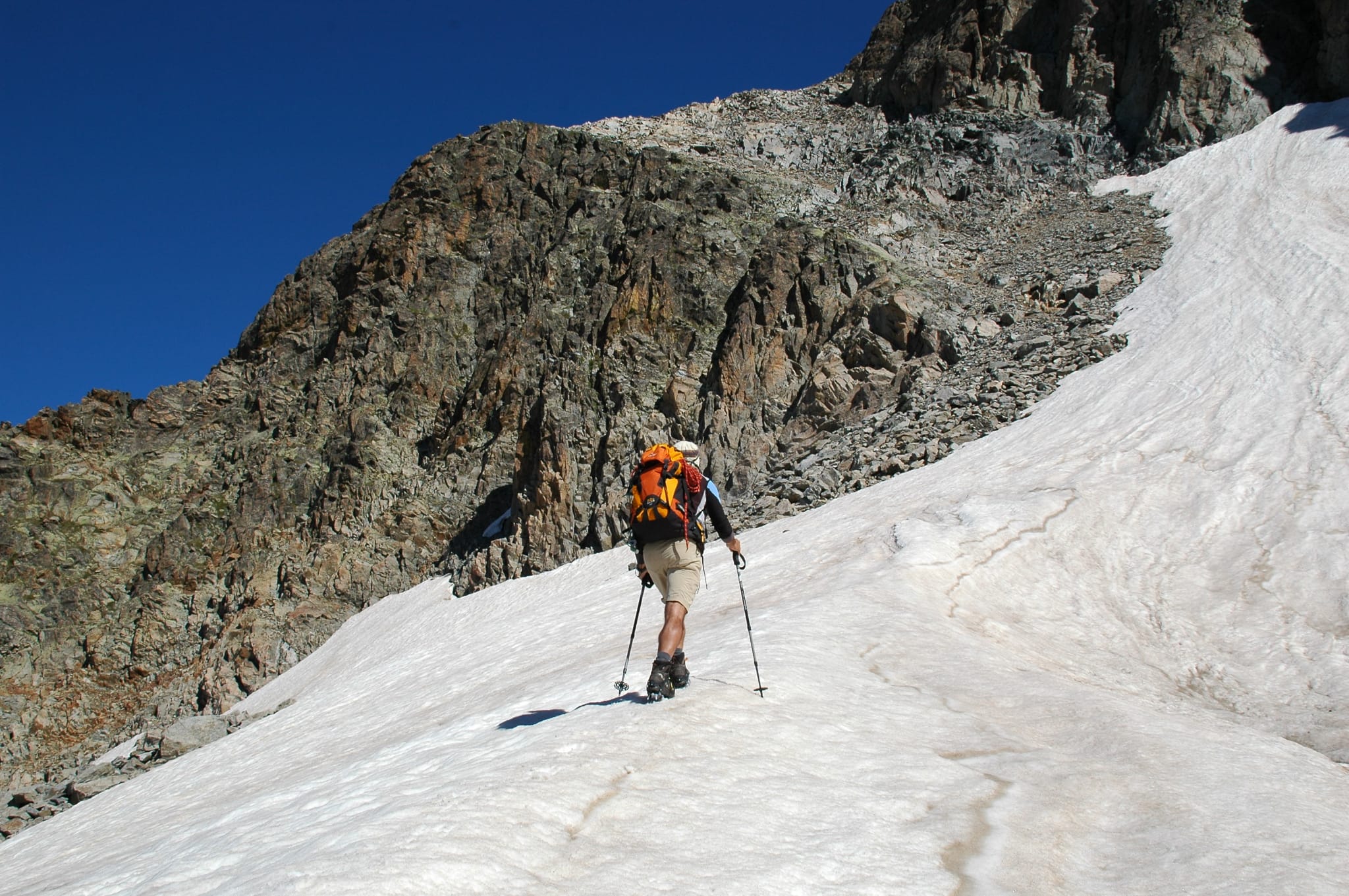 Nunca faltan los bastones de trekking, especialmente para caminar en nieve o en glaciares y, cuando se trata de lugares inaccesibles, lleva una radio “ante cualquier contingencia”.