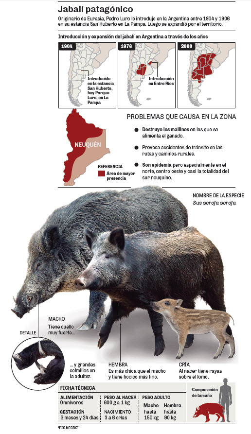 Dentro de las especies exóticas, el jabalí en los últimos diez aumentó su rango de distribución notablemente. Es una especie muy plástica, se adapta a todos los climas y ambientes, tiene un alto poder reproductivo y es una de las que más avanza territorialmente en la provincia.