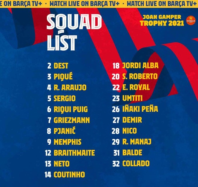 Para el partido de esta tarde, que comenzará a las 16.30, Barcelona tendrá disponibles a Sergiño Dest, Gerard Piqué, Ronald Araujo, Sergio Busquets, Riqui Puig, Antoine Griezmann, Miralem Pjanic, Memphis Depay, Martin Braithwaite, Neto, Jordi Alba, Sergi Roberto y Samuel Umtiti.