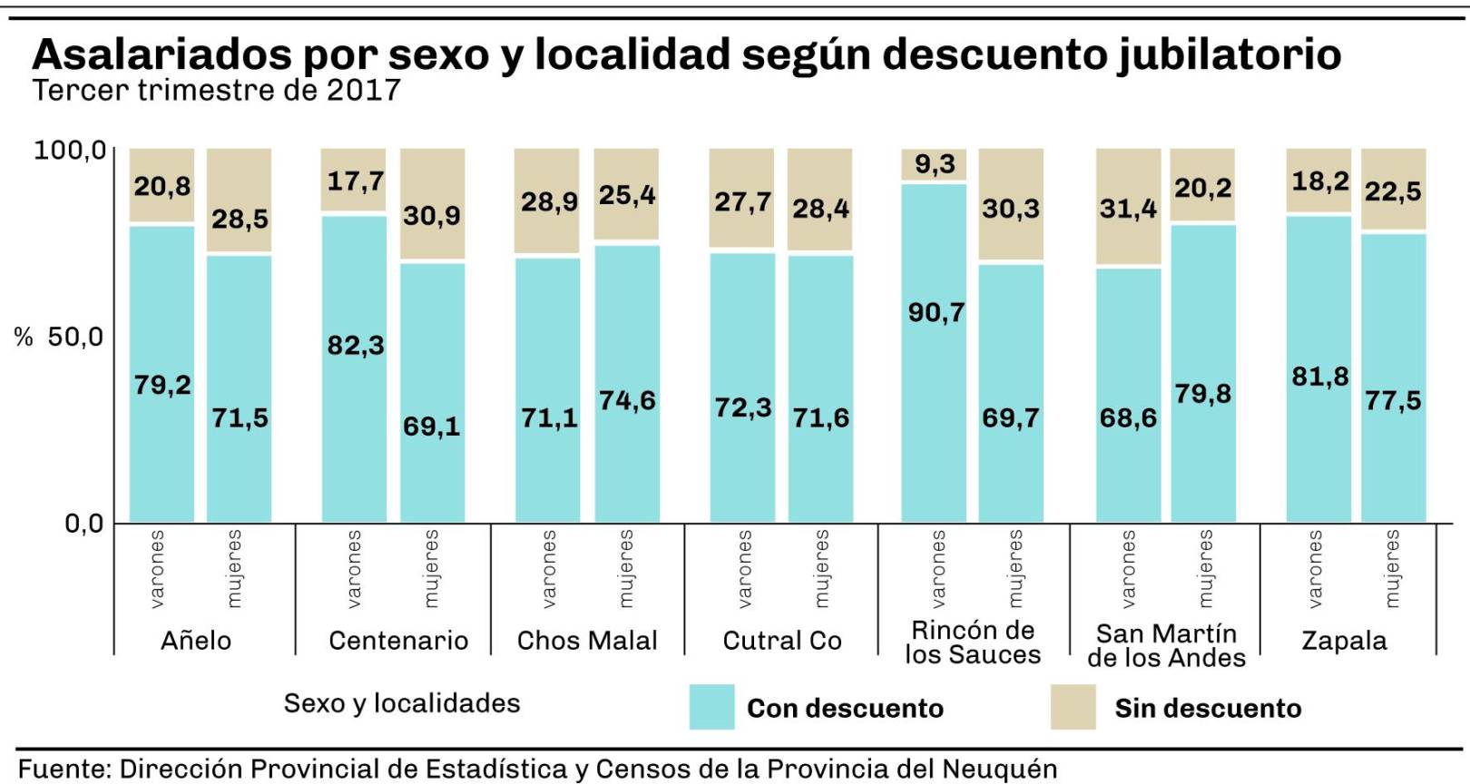 El 68% de la población asalariada percibe descuento jubilatorio. Cuando se desagregan los datos por sexo se advierten las desigualdades. Según un informe hecho sobre la base de la Encuesta Provincial de Hogares, correspondiente al tercer trimestre de 2017, que analiza siete localidades de Neuquén, en Rincón de los Sauces el 30,3% de las mujeres empleadas están en trabajos en los que no se les garantiza la seguridad social, mientras que el porcentaje de varones, en la misma situación, es del 9,3%. Salvo Chos Malal y San Martín de los Andes las diferencias se mantienen en Añelo, Centenario, Cutral Co y Zapala.