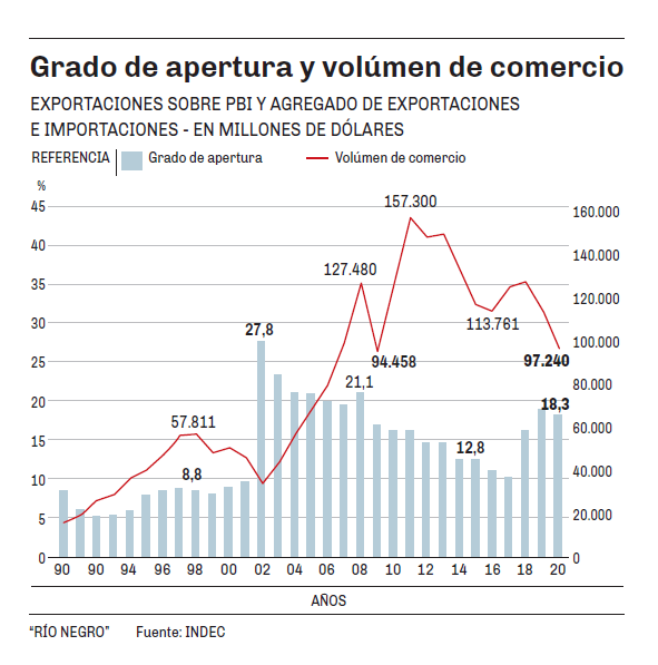 A lo largo de las últimas tres décadas se registraron en Argentina dos periodos marcadamente aperturistas. El primero va de 1990 hasta 1999. En seis de esos nueve años hubo déficit comercial. Entendiendo por volumen de comercio a la suma de exportaciones más importaciones, el mismo registró un máximo de u$s 57.800 millones en dicho periodo. A su vez, el grado de apertura económica medido como el cociente entre las exportaciones y el PBI medido en dólares, registra un magro máximo del 8,8%. El segundo periodo aperturista va de 2016 a 2019. En 2 de los 4 años considerados, hubo déficit comercial. El volumen de comercio tuvo un techo de u$s 127.000 millones en 2018, y el grado de apertura llegó al 19% en 2019. Este último dato requiere una aclaración: en años donde se registra una fuerte y brusca devaluación (1990, 2002, 2018, 2019) se reduce notablemente el PBI medido en dólares, lo que automáticamente hace subir el ratio Exportaciones/PBI.